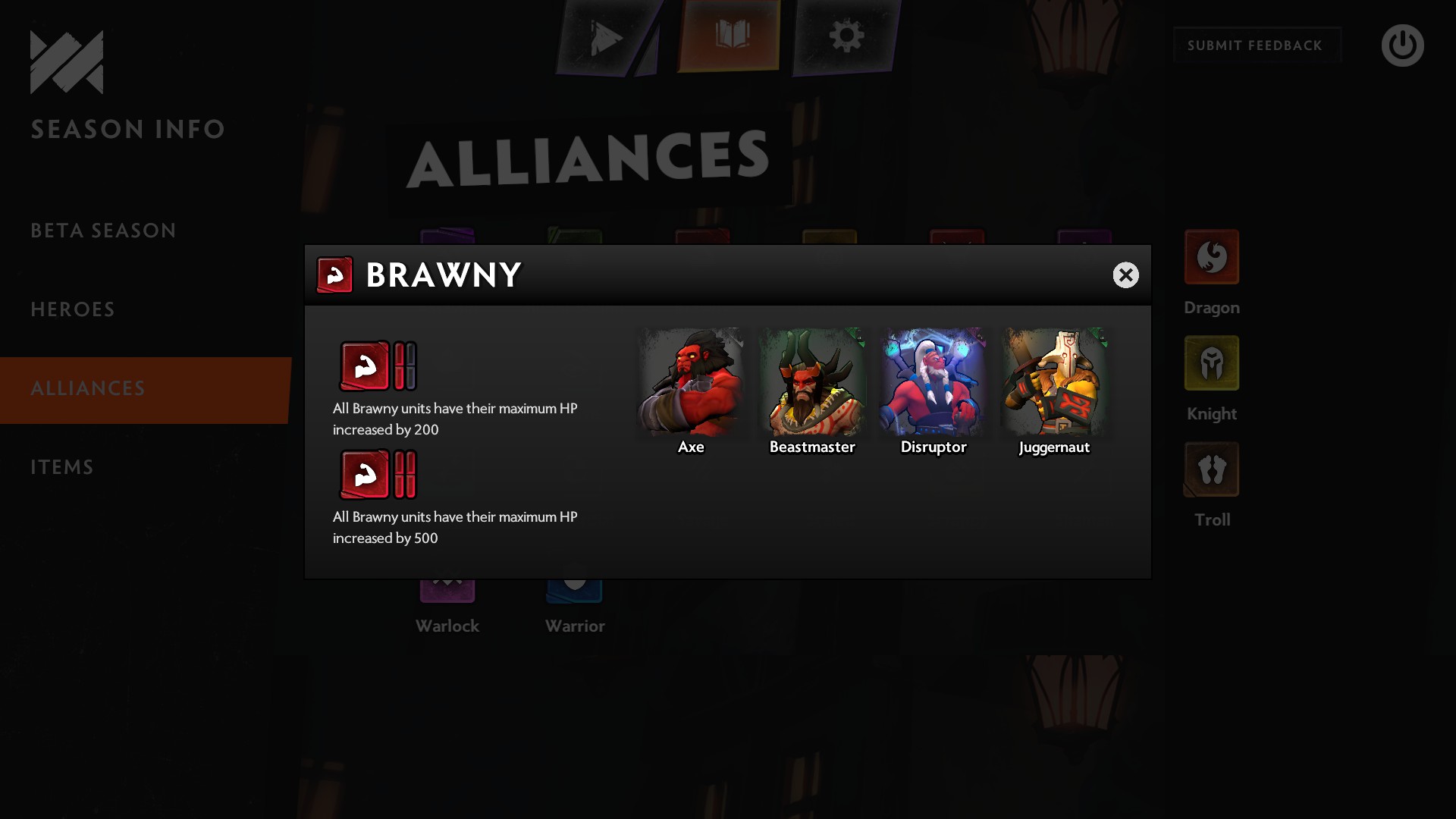 Örneğin: Her kahraman, her biri farklı bonuslar veren 23 farklı ittifak ile bir İttifak'a aittir. Bu bonuslar, aynı İttifakın tahtada oyunda yeteri kadar kahramanına sahip olduğunuzda aktif hale gelir. Bazı İttifak bonusları sadece oyunda tek bir kahramana ihtiyaç duyabilirken, diğerleri 2, 3, 4 vb. Durumlarda aktif olur ve meraklıları için çok fazla katman vardır.