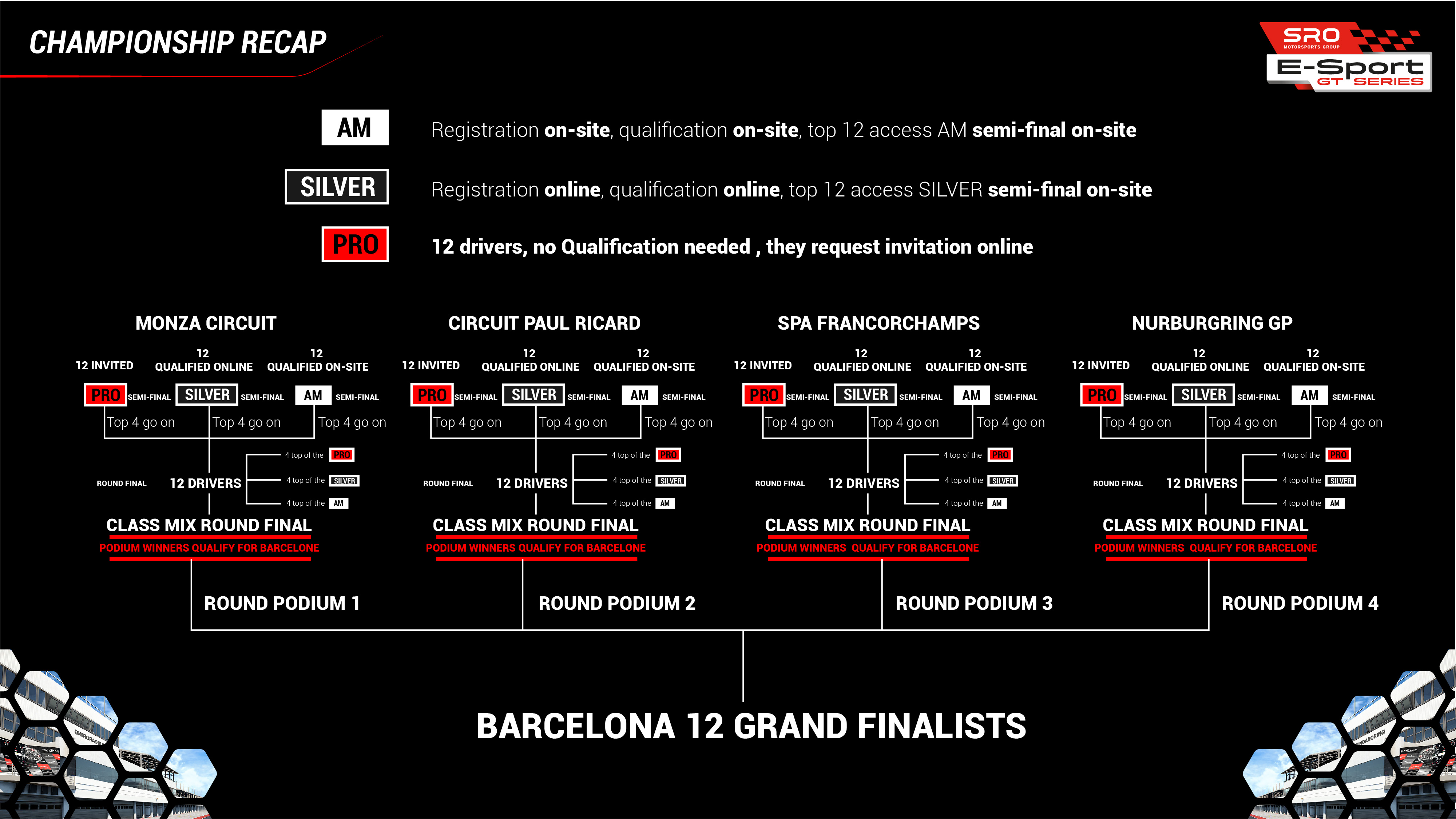 Her yarı finalin en iyi 4 sürücüsü (en iyi 4 AM, 4 SILVER, 4 PRO yarı finalisti) Round finaline (sonra en iyi 4 AM, 4 SILVER, 4 PRO'dan oluşan toplam 12 sürücü arasından girecektir. ). Bu yarış rutini, Monza Yarış Pisti, Paul Ricard Pisti, Spa Francorchamps, Nurburgring GP) 4 eleme turunun her birine uygulanacak.