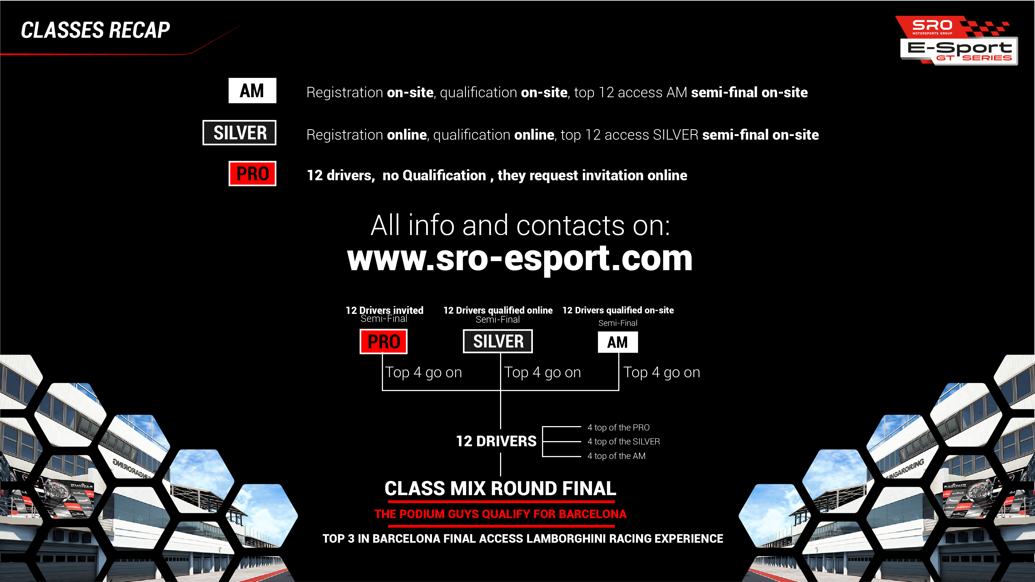 E-spor yarışmasında, hepsi aynı amaç için mücadele eden 3 sınıf yer alacak: Lamborghini Squadra Corse sayesinde yarış deneyimine erişmek. Her üç sınıf da aynı yarışmada! 12 yüksek uçlu simülatörün mevcut olacağı ve SRO E-SPORT organizatörleri tarafından tamamen kurulacakları yerinde yarışlara nasıl hak kazanacaklarına bağlı olarak basitçe 3 gruba (AM = Amatör, SILVER, PRO) ayrılırlar. GT Serisi